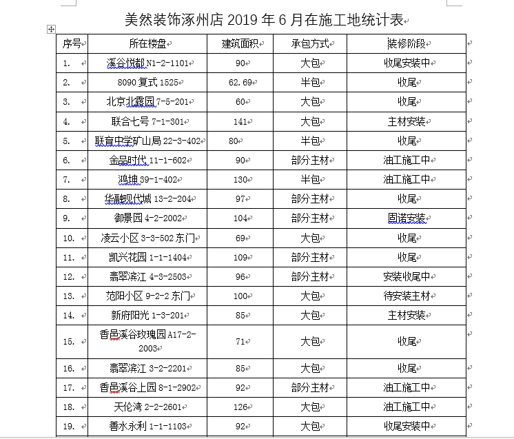 美然裝飾7月份在施項目數(shù)量達到80個,其中涿州在施項目共54個,高碑店23個,北京3個。